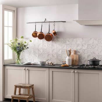 Jardin Marsh features trailing foliage and wispy, delicate leaves with each of the four faces showcasing more of the pattern. Use all four faces across an expanse of wall for a striking look or, for a more pared back scheme, team Jardin Marsh with Cotton field tiles, creating subtle detail and pops of colour.