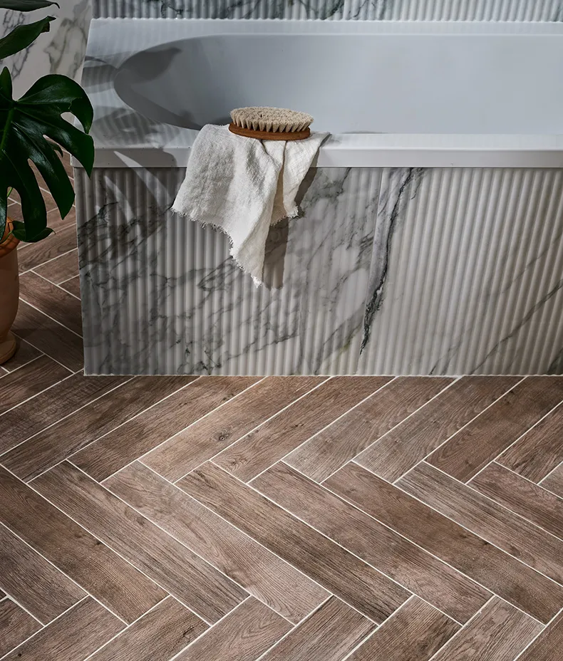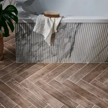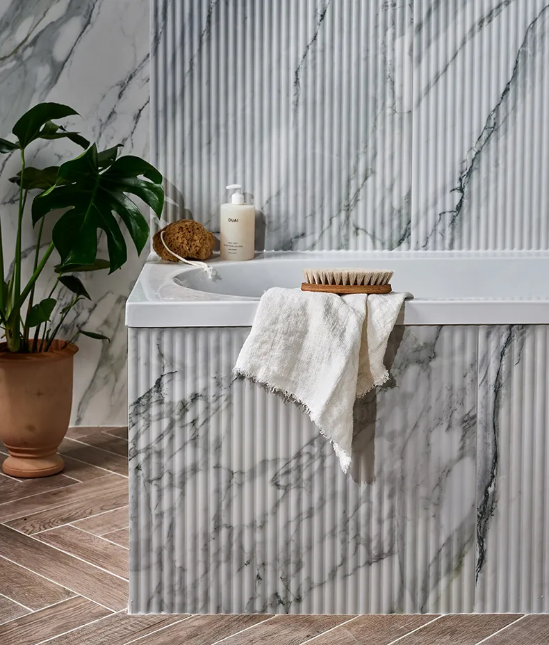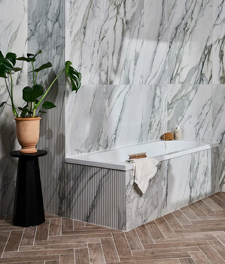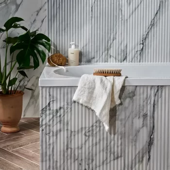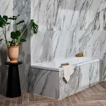 Inspired by the clean, natural style found in the iconic city of Palm Springs, California, these marble effect tiles come with a beautiful fluted option for textural opulence, a matching flat tile, and a rounded beading to really complete the effect.