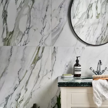 Inspired by the clean, natural style found in the iconic city of Palm Springs, California, these marble effect tiles come with a beautiful fluted option for textural opulence, a matching flat tile, and a rounded beading to really complete the effect.