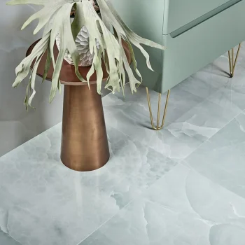 Exclusively sold instore at Ca’ Pietra retail showrooms nationwide. This large format polished tile in a soothing aqua shade, taps into the trend for onyx designs.